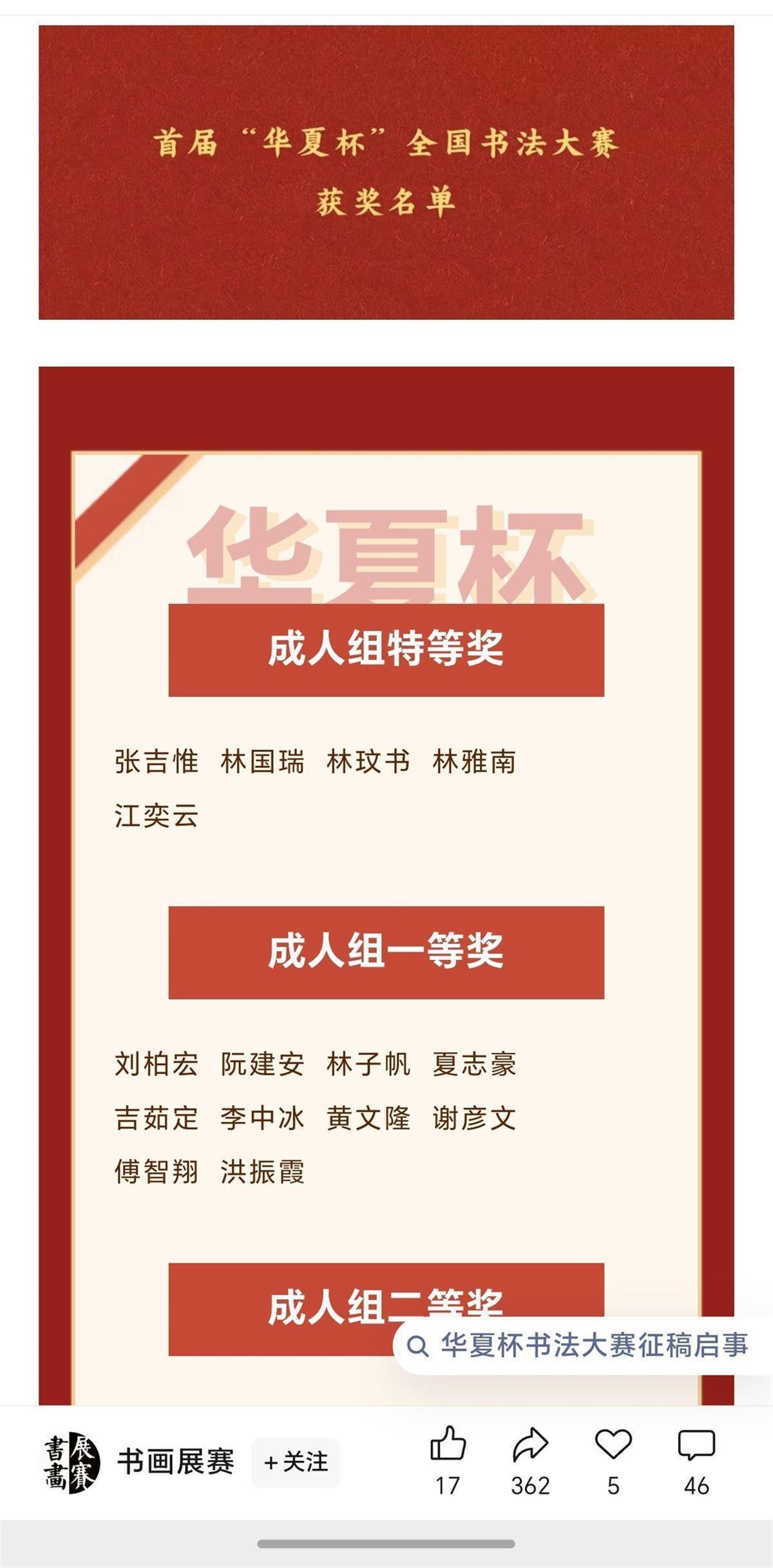 极目新闻记者注意到,公众号“书画展赛”转发了获奖名单。12月4日上午,作者还置顶评论称:“大家该保存的保存,该截图的截图,赛事官方公众号已经删除”。记者发现,该赛事的征稿启事发布于“书法学习指南”“书法艺站”等公众号,且启事中的截稿时间也有不同,目前“书法学习指南”中的相关信息已被删除。