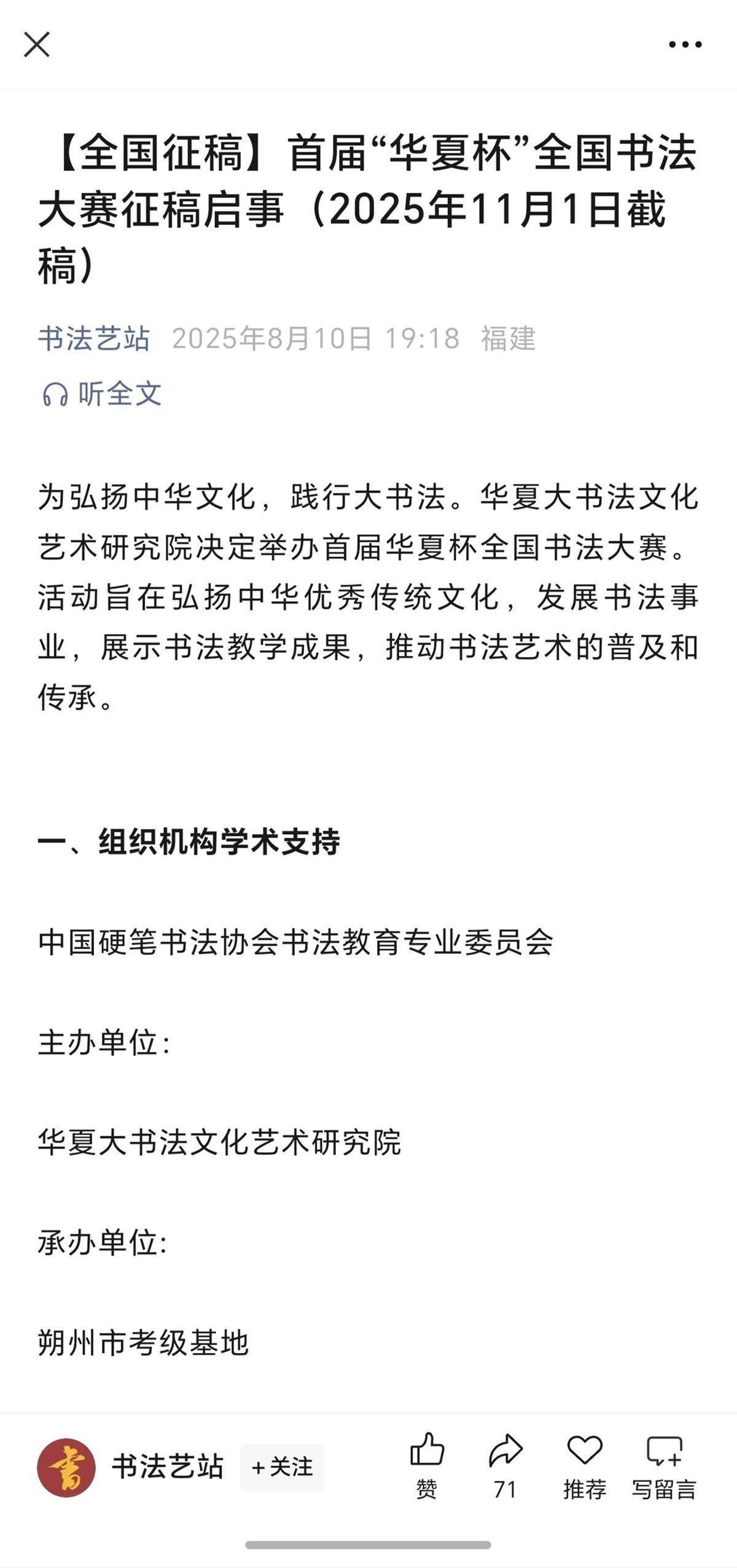 根据公众号“书法艺站”发布的征稿启事,该书法大赛主办单位为华夏大书法文化艺术研究院,征稿对象:全国书法家、书法爱好者均可投稿,本届大赛分为成人组和学生组,同时设置有奖项:成人组一等奖5名,奖金1000元/人,二等奖10名,奖金500元/人……同时此次大赛每幅作品收取通联费用30元(包含邮寄费,证书费)。