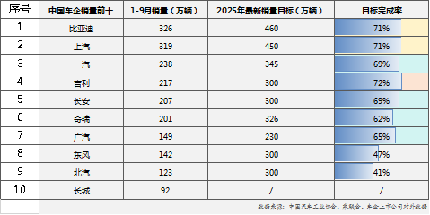 从销量前十车企的竞争格局来看,比亚迪与上汽集团共同占据第一梯队位置,1-9 月累计销量均突破 300 万辆。其中,比亚迪以 326 万辆的累计销量稳居行业榜首,已顺利完成其全年 460 万辆最新销量目标的 71%,凭借在新能源领域的技术优势与产品矩阵,持续巩固行业领先地位。上汽集团同期累计销量达 319万辆,全年目标完成率同样为 71%,在燃油车市场稳步推进、新能源车型加速布局的 “双线并行” 策略下,保持了稳健的增长节奏。